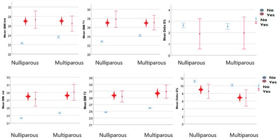We noticed a statistically significant difference between the BMIs of nulliparous and multiparous women. This difference was visible before pregnancy and continued throughout the entire gestational period. This aspect led us to separately evaluate multiparous and nulliparous women for each parameter.