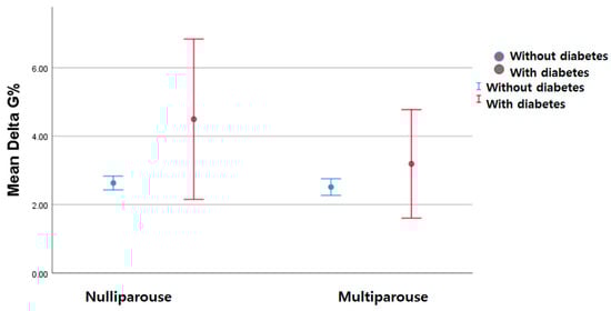The literature proves a direct relationship between the increase in obesity rates and pre-pregnancy diabetes []. These two pathologies are highly interconnected. This is sustained by our results, which obtained a higher BMI in diabetic women compared with non-diabetic ones and a statistically significantly increased BMI in multiparous women. However, the weight gain during pregnancy until the second morphological scan was not statistically significantly higher in women with chronic diabetes than in those without.