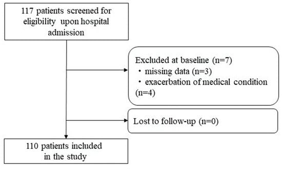 A total of 117 femur fracture patients were admitted to the wards for the first time during the study period. Individuals who needed acute care because their medical condition was worsening (n = 4) or had missing data (n = 3) were not included. Ultimately, 110 patients’ data were incorporated into the analysis (Figure 1).