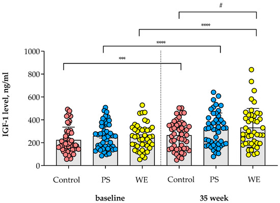 Changes in IGF-1 levels within the study groups. The IGF-1 levels of the child subjects were compared both between groups and from baseline to the 35th week of the follow-up period. The bar graph represents the means, while the error bars indicate standard error of the mean (SEM). *** indicates statistical significance within group at p < 0.001. **** indicates statistical significance within group at p < 0.0001. # indicates statistical significance between groups at p < 0.05. Abbreviations; PS = protein substitute group; WE = whole egg group; IGF-1 = insulin-like growth factor 1.