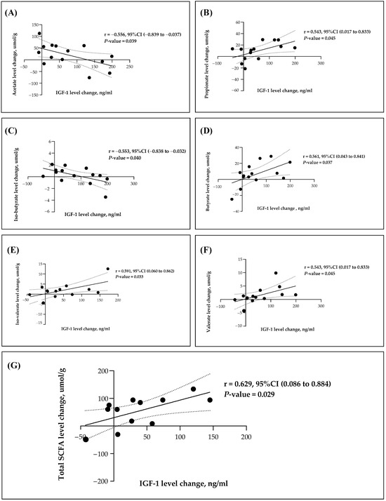 Pearson’s coefficient between changes in each SCFA and IGF-1 levels. This figure illustrates the correlation between changes in SCFAs and IGF-1 levels. The comparison involves the alterations in SCFA and IGF-1 values between the baseline and week 35. (A) Correlation between changes in acetate and IGF-1; (B) Correlation between changes in propionate and IGF-1; (C) Correlation between changes in isobutyrate and IGF-1; (D) Correlation between changes in butyrate and IGF-1; (E) Correlation between changes in isovalerate and IGF-1; (F) Correlation between changes in valerate and IGF-1; (G) Correlation between changes in total SCFA and IGF-1. The black points indicate observations. The solid line represents predictions, while the dashed lines indicate the 95% CI. Abbreviation: SCFA, short-chain fatty acids; IGF-1, insulin-like growth factor 1.