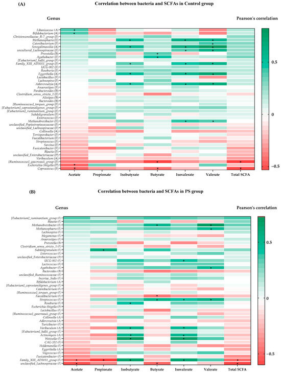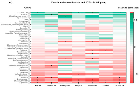 Heatmap of Pearson’s coefficient between top 42 differential abundance of gut microbiota and concentrations of SCFAs. (A) Control group (B) PS group (C) WE group. The bacterial genus is sorted from negative (brick red squares) to insignificant (white squares) to positive (brick green squares) correlations. Significant correlations are marked by * (correlation coefficient ≥ ±0.3). Abbreviations: (A) = Actinobacteriota; (F) = Firmicutes; (C) = Cyanobacteria; (P) = Proteobacteria; (E) = Euryarchaeota; (B) = Bacteroidota.