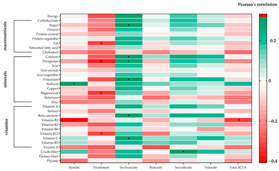 Heat map of Pearson’s coefficient between SCFA and nutrients. The nutrient composition is sorted from negative (red) to positive (green) correlations, assessed by Pearson’s correlation. Significant correlations are marked by * (correlation coefficient ≥ ±0.3).