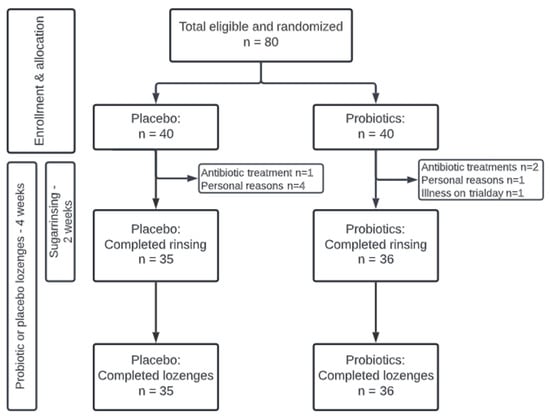 The present study was performed at the Department of Odontology, University of Copenhagen, from November to December 2021 as a quadruple-blinded (participant, care provider, investigator, outcome assessor), randomized, placebo-controlled, clinical trial with a total duration of 28 days. At baseline, computerized randomization (www.randomizer.org accessed on 29 October 2021) was performed by DB to allocate participants to receive either probiotic or placebo lozenges twice daily throughout the trial period. During randomization, the numbers 1–80 were allocated to either the probiotic or placebo group, whereafter DB fitted the numbers to identical-looking probiotic or placebo pots. Furthermore, all participants received a 10% sucrose solution, which they were instructed to rinse with 6–8 times a day for the initial 14 days of the trial period. Clinical examination and sample collection were performed at baseline, day 14, and day 28 and all subjects signed informed consent before participation. Normal oral hygiene procedure was followed throughout the trial. Microbial data from the placebo group have been published previously []. The study was approved by the regional ethical committee (H-21003295) and performed following the Helsinki Declaration. Finally, the study was registered at ClinicalTrials.gov (UCPH_01_005) and reported to the local data authorization of the Faculty of Health and Medical Sciences, University of Copenhagen (514-0434/19-3000). The timeline of the study is detailed in Figure 1.