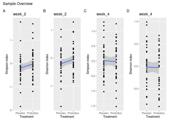 Intragroup comparison of α-diversity showed a significant loss of diversity from baseline to day 14 in the placebo group with the Shannon index (p = 0.02), which was borderline significant with the Simpson index (p = 0.06). This loss was not visible in the probiotic group (Shannon index, p = 0.6 and Simpson index, p = 0.1). Yet, when comparing α-diversity between groups, this difference failed to reach significance using both the Simpson and Shannon indices (p = 0.23, p = 0.2) (Figure 2A,B). On day 28, there were no noteworthy differences in α-diversity using either the Simpson or Shannon index (p = 0.83, p = 0.91) (Figure 2C,D).