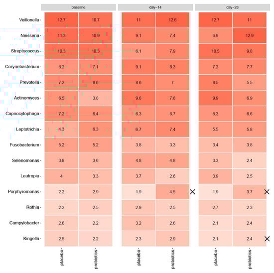 Impact of sugar stress on predominant microbiota for the placebo and probiotic groups, respectively, and mean values of relative abundance of 15 predominant genera. X marks significant differences between groups. Intensity of coloration marks increasing abundance.