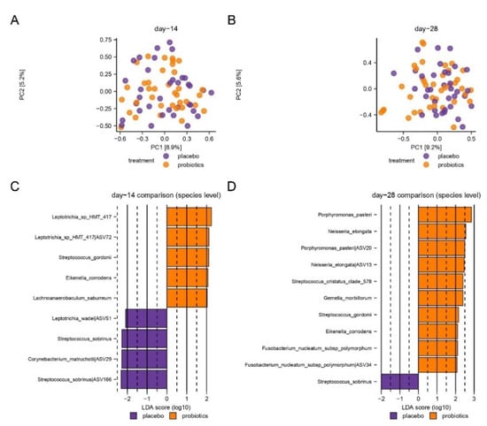 LEfSe identified 13 species (Figure 4C,D), which were significantly different in the probiotic group versus the placebo group. Specifically, on day 28, Streptococcus gordinii and Neisseria elongata were associated with the probiotic group. In contrast, Streptococcus sobrinus was associated with the placebo group on both day 14 and day 28.