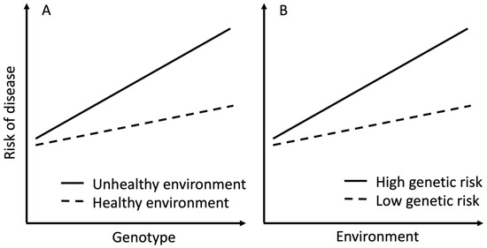 There is growing interest in understanding whether PGSs interact with environmental factors to affect health risks. Statistically speaking, a gene–environment interaction can be conceptualised as either an effect of a genotype on a trait or disease risk differing between individuals with different levels of environmental exposure (Figure 1A) or an effect of an environmental exposure on a trait or disease risk differing between individuals with different genotypes (Figure 1B). Several biological models have been proposed to interpret a gene–environment interaction, such as a genotype increasing a person’s exposure to an environmental factor or a genotype mediating the effect of exposure on a disease [10]. Studies using data from large genetic studies such as the UK Biobank have shown PGS–lifestyle interactions for body mass index (BMI) [11,12], cardiovascular disease [13], type 2 diabetes [13], and lipid levels [14], but not for the incidence of dementia [15]. Other studies have found no evidence for PGS–lifestyle interactions on cardiovascular diseases [16] or cancer [17]. A PGS–environment interaction is often interpreted from the point of risk prediction, for example, that genetic contribution to disease risk depends on the level of environmental risk factors or, in the case of PGS–lifestyle interaction, obesogenic environment accentuates the risk in genetically susceptible individuals.