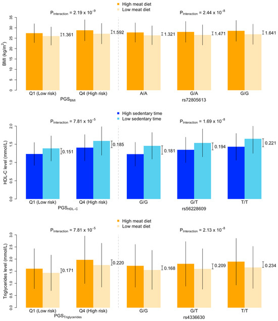 Descriptive statistics of the cardiometabolic risk factors grouped by their PGSs are summarised in Supplementary Table S2. In the PGS–lifestyle interaction analyses, we found four, three, and four significant interactions for BMI, HDL-C, and triglycerides (Figure 2; Supplementary Table S3), among which four, one, and one interactions, respectively, were significant in the sensitivity analyses (p < 0.05; Supplementary Table S4), including PGSBMI with meat diet, physical activity, sedentary time, PGSHDL-C with sedentary time, and PGSTriglycerides with meat diet. In the PGS-stratified association analyses, the absolute effects of lifestyles on cardiometabolic risk factors tended to be larger in the high PGS groups compared to those in the low PGS groups. For example, the effect of meat diet on BMI was larger among individuals in the high PGSBMI group (β [95% confidence intervals] = 0.152 [0.145, 0.159]) than that in the low PGSBMI group (β = 0.125 [0.119, 0.132]); the negative effect of sedentary time on HDL-C was larger in the high PGSHDL-C group (β = −0.131 [−0.140, −0.122]) than that in the low PGSHDL-C group (β = −0.103 [−0.110, −0.095]). A similar pattern was observed when comparing the mean of cardiometabolic risk factors between those with high and low levels of lifestyle factors. For example, in the high PGSBMI group, the difference in BMI between those with a high- and low-meat diet was 1.592 kg/m2, whereas in the low PGSBMI group, the difference in BMI between those with a high- and low-meat diet was only 1.361 kg/m2 (top panel in Figure 3, Supplementary Table S5).