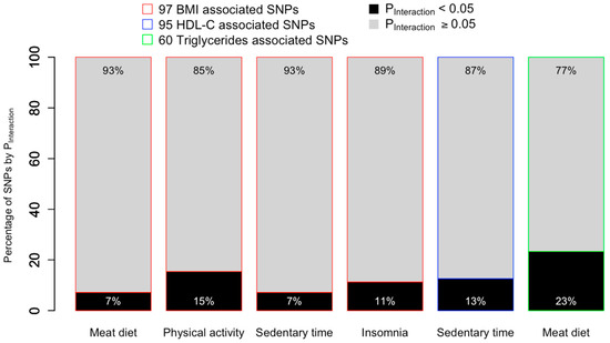 Percentage of cardiometabolic risk factor-associated SNPs that interact with lifestyle factors to affect their corresponding cardiometabolic outcomes in the SNP-based interaction analyses. Values within the black portion of the bar chart represent the percentage of GWAS-identified SNPs that were significant in the SNP-based interaction analyses (PInteraction < 0.05), whereas values within the grey portion of the bar represent the percentage of GWAS identified SNPs with PInteraction ≥ 0.05. For example, among the 97 BMI-associated SNPs, 7 SNPs (equivalent of 7%) interacted with meat diet with PInteraction < 0.05.