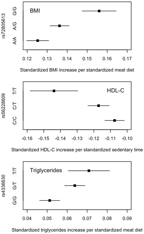 When examining the full set of SNPs, three SNP–lifestyle interactions reached the uncorrected genome-wide significance threshold of p < 5 × 10−8 (Supplementary Table S9), all of which (or SNPs in linkage disequilibrium) had been associated with their corresponding risk factors (as main effects). When grouping the individuals by their genotypes at these loci, there was a clear pattern indicating that the associations between lifestyles and cardiometabolic risk factors were different between genotype groups; for example, the effect of meat diet on BMI increased with the number of rs72805613 G alleles (Figure 5). The difference in the effects between those with no G allele and those with two G alleles was 0.031 (i.e., β = 0.125 and 0.156 in the A/A and G/G groups, respectively) (Supplementary Table S10), similar to the difference in the effects between those with high and low PGSBMI. (i.e., β = 0.125 and 0.152 in the low and high PGSBMI groups, respectively (Supplementary Table S3). Furthermore, among individuals with no G allele, the difference in BMI between those with a high- and low-meat diet was 1.321 kg/m2, whereas among those with two G alleles, the difference in BMI between those with a high- and low-meat diet was 1.641 kg/m2, similar to the differences in the high and low PGSBMI groups (top panel in Figure 3). A similar pattern was also observed for the comparisons between rs56228609 genotypes and PGSHDL-C and between rs4336630 and PGSTriglycerides (Figure 3).