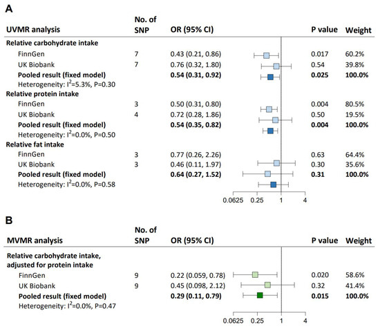 UVMR and MVMR estimates for the causal association between relative carbohydrate intake and hypertension. (A) UVMR assessing the causal effects of relative carbohydrate intake, protein intake, and fat intake on hypertension. (B) MVMR assessing the independent causal effect of relative carbohydrate intake on hypertension. The blue squares represent UVMR estimates for the effects of macronutrient intakes on hypertension, and the green squares represent MVMR estimates for the effects of macronutrient intakes on hypertension, with light ones representing the results from FinnGen or UK Biobank and dark ones representing the pooled results. ORs (95% CIs) were based on the IVW (UVMR) and MV-IVW (MVMR) analyses, indicating the risk for hypertension per 1-SD increase in relative carbohydrate, fat, or protein intake. CI, confidence interval; IVW, inverse variance weighted; MV-IVW, multivariable inverse variance weighted; MVMR, multivariable Mendelian randomization; OR, odds ratio; SD, standard deviation; SNP, single nucleotide polymorphism; UVMR, univariable Mendelian randomization.