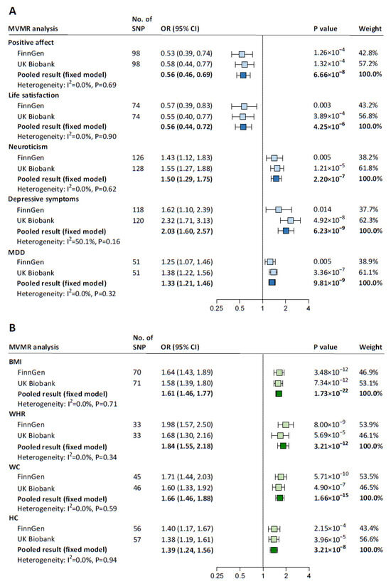 MVMR estimates for the causal association between each mediator and hypertension with adjustment for relative carbohydrate intake. (A) MVMR assessing the direct causal effect of each psychological well-being indicator on hypertension with adjustment for relative carbohydrate intake. (B) MVMR assessing the direct causal effect of each adiposity trait (BF% was excluded from the mediation analyses for its reverse causal association with relative carbohydrate intake) on hypertension with adjustment for relative carbohydrate intake. The blue squares represent MVMR estimates for the direct causal effect of each psychological well-being indicator on hypertension with adjustment for relative carbohydrate intake, and the green squares represent MVMR estimates for the direct causal effect of each adiposity trait on hypertension with adjustment for relative carbohydrate intake, with light ones representing the results from FinnGen or UK Biobank and dark ones representing the pooled results. ORs (95% CIs) were based on the MV-IVW analyses, indicating the risk for hypertension associated with each psychological well-being indicator or each 1-SD increase in each adiposity trait. BF%, body fat percentage; BMI, body mass index; CI, confidence interval; HC, hip circumference; MDD, major depressive disorder; MV-IVW, multivariable inverse variance weighted; MVMR, multivariable Mendelian randomization; OR, odds ratio; SD, standard deviation; SNP, single nucleotide polymorphism; WC, waist circumference; WHR, waist-to-hip ratio.
