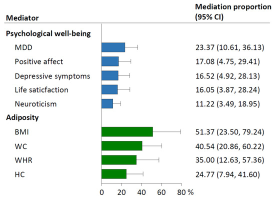 We selected five psychological well-being indicators and five adiposity traits as potential mediators. GWAS data for positive affect, life satisfaction, neuroticism, and depressive symptoms were from a model-averaging genome-wide association meta-analysis of up to 1,295,946 participants from the SSGAC, Understanding Society, UK Biobank, 23 and Me, and Cohorts for Heart and Aging Research in Genomic Epidemiology Consortium [15]. GWAS data for major depressive disorder (MDD) were from the Psychiatric Genomic Consortium (n = 500,199), where individuals having received a clinical diagnosis or treatment for depression were classified as cases [16]. GWAS data for body mass index (BMI), waist-to-hip ratio (WHR), waist circumference (WC), and hip circumference (HC) were obtained from the Genetic Investigation of ANthropometric Traits consortium based on up to 322,154 participants aged 12 to 113 years [17,18]. GWAS data for body fat percentage (BF%) were from the UK Biobank (n = 454,633) [21].