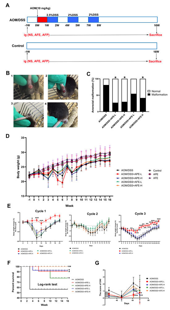 Effects of APE and AFE on the physiological indices of the CAC mice. (A) Schematic diagram of the animal experimental study. (B) Representative appearance of the CAC mice by the end of th trial (1: anorectal prolapse; 2: anal bleeding; 3 and 4: anus turgescence and extrudes out). (C) The incidence rate of anorectal malformation in each group. (D) Changes in the body weight of the mice were recorded each week during the entire study. (E) Body weight changes of CAC mice in the AOM/DSS-induced groups during the three DSS cycles. (F) The survival curve. (G) The DAI score of the mice in each group. Data are presented as the mean ± SD; * p < 0.05, ** p < 0.01, *** p < 0.001 vs. AOM/DSS group.