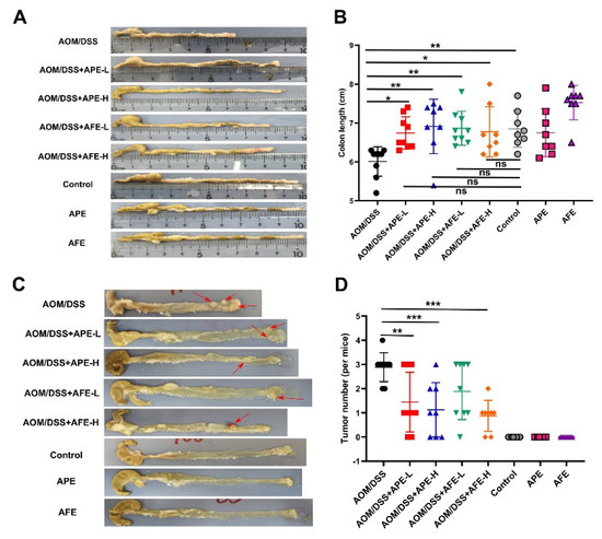 Increased inflammation of the colon is always positively associated with a decrease in colon length, in the present study, and the colon length of the model group was significantly shorter than the control group, while the intervention with APE and AFE markedly enhanced the colon length of the AOM/DSS-treated mice (Figure 2A,B). Upon necropsy, the CAC mice displayed bunchy neoplasms near their anus in the middle and posterior segments of their colon, and every mouse in the groups that were exposed to AOM/DSS developed tumors. But compared to the model group, there were substantially fewer total numbers of tumors in the APE and AFE administration groups (Figure 2C,D).