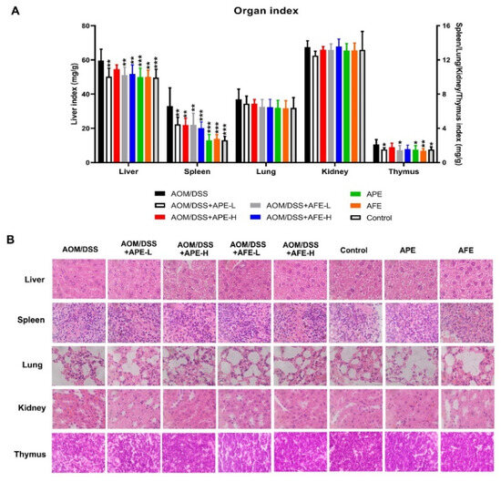 Toxicity evaluation of APE and AFE. (A) The organ coefficients (liver, spleen, lungs, kidneys, and thymus) of each group. (B) H&E staining of organs (liver, spleen, lungs, kidneys, and thymus). Data are presented as the mean ± SD; * p < 0.05, ** p < 0.01, *** p < 0.001 vs. AOM/DSS group.