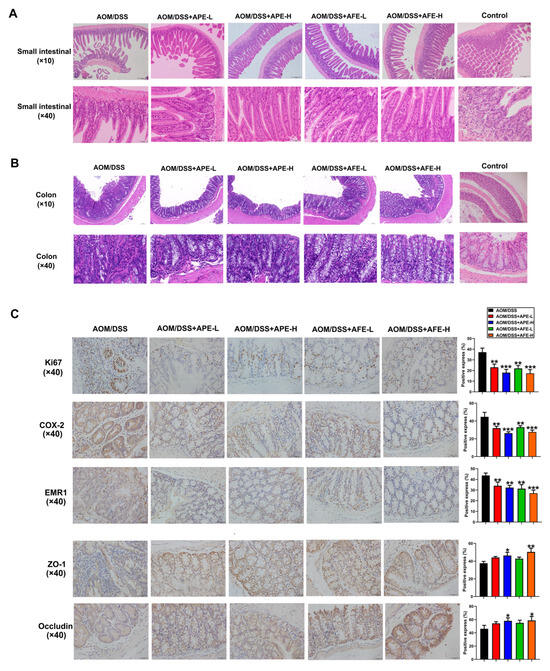 Immunohistochemistry examination showed that CRC earl markers, including Ki67, COX2, and EMR1, were highly expressed in the colons in the model group, but these indicators showed lower expression in the APE and AFE intervention groups than in the model group. Moreover, we tested the expression of zonula occludens-1 (ZO-1) and occludin in the colon tissues, and found that, compared to the AOM/DSS group, the expression of ZO-1 and occludin was obviously elevated in the colon by APE and AFE treatment.