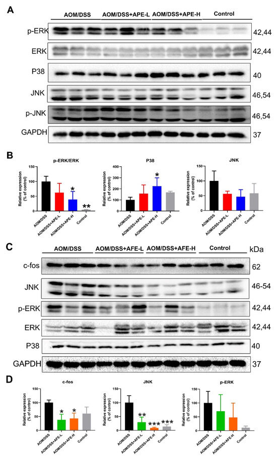 We studied mitogen-activated protein kinases (MAPKs), the key efficient molecule that mediates proinflammatory signaling, and Western blot analysis showed (Figure 6A–D) that the relative levels of JNK and p-ERK were upregulated in the AOM/DSS group. While in comparison with the AOM/DSS group, APE intervention markedly suppressed the phosphorylation of ERK and activated P38 expression, and AFE administration markedly inhibited p-ERK, c-fos, and the downstream target gene c-fos. These above data suggest that APE and AFE conferred prominent protective effects against AOM/DSS-induced CAC in the C57BL/6 mice by suppressing inflammatory responses such as the regulation of the MAPKs signaling pathways.