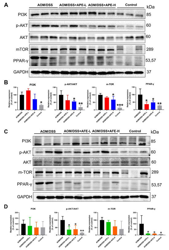 APE and AFE inhibited PI3K/AKT/mTOR signal transduction in the colonic tissues of the CAC mice. (A) APE suppressed the expression of PI3K/AKT/mTOR signal transduction. (B) The relative intensities of PI3K, p-AKT/AKT, m-TOR, and PPAR-γ expression after normalization to GAPDH. (C) AFE inhibited the expression of PI3K/AKT/mTOR signal transduction in the colonic tissues. (D) The relative intensities of PI3K, p-AKT/AKT, m-TOR, and PPAR-γ expression after normalization against GAPDH. Data are presented as the mean ± SD; * p < 0.05, ** p < 0.01, *** p < 0.001 vs. AOM/DSS group.