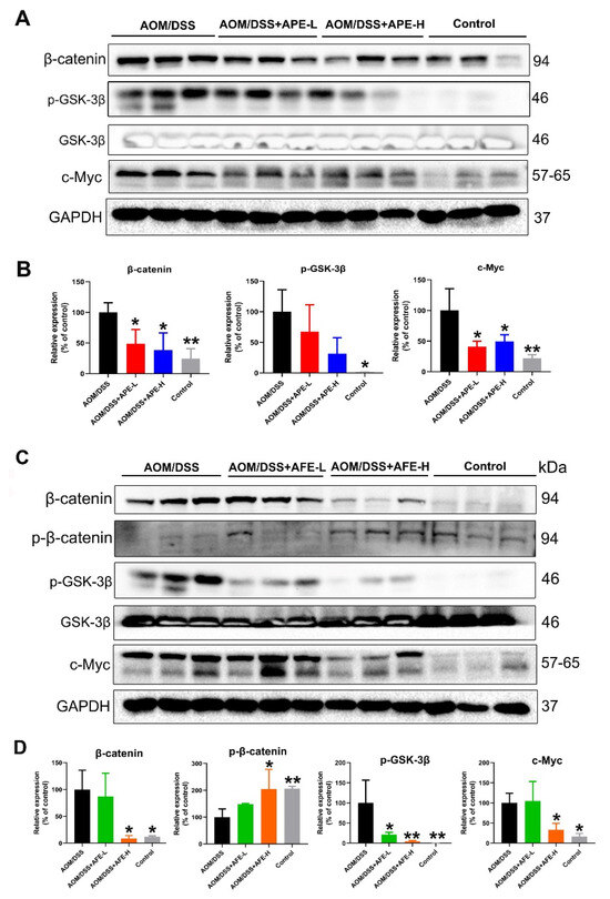 Effects of APE and AFE on Wnt/β-catenin signaling-related genes in the colonic tissues of the AOM/DSS mice. (A) APE inhibited the expression of Wnt/β-catenin signal transduction in colonic tissues. (B) The relative intensities of β-catenin, p-GSK-3β, and c-Myc after normalization against GAPDH. (C) AFE inhibited the expression of Wnt/β-catenin signal transduction in colonic tissues. (D) The relative intensities of β-catenin, p-β-catenin, p-GSK-3β, and c-Myc expression after normalization against GAPDH. Data are presented as the mean ± SD; * p < 0.05, ** p < 0.01 vs. AOM/DSS group.