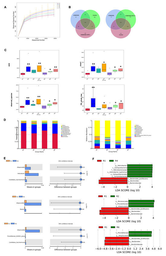 APE and AFE modulated the diversity and structure of the intestinal flora in the CAC mice. (A) Rarefaction curve. (B) The OTUs of each group. (C) Alpha diversity analyzed by ACE, Chao 1, observed_species, and PD_whole_tree. (D) The relative abundance of the flora at various levels. (E) T_test analysis of the different species between test groups. (F) LEfSe analysis of the dominant biomarker taxa. Data are presented as the mean ± SD; * p < 0.05, ** p < 0.01 vs. AOM/DSS group.