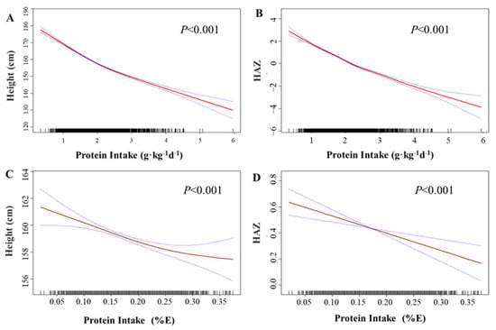 Figure 1 illustrates the dose–response relationship between protein intake and linear growth of the participants. In the fully adjusted Model II, a significantly negative association was observed between protein intake (g·kg−1·d−1) and body height (Figure 1A) (p < 0.001), as well as HAZ (Figure 1B) (p < 0.001). A similar relationship was found between protein intake (%E) and body height (Figure 1C) (p < 0.001) and HAZ (Figure 1D) (p < 0.001). Results from the generalized linear model (Table 2) indicated that each unit increase in protein intake (g·kg−1·d−1) was associated with a change in body height by −9.45 cm (95% CI: −9.72, −9.18) and a change in HAZ by −0.21 (95% CI: −0.25, −0.18) in the crude model. After adjusting for participant demographics, lifestyle factors, and paternal factors in Model I, each unit increase in protein intake was found to be associated with a change in height by −5.79 cm (95% CI: −6.12, −5.45) and a change in HAZ by −0.78 (95% CI: −0.83, −0.73). Further adjustment for serum calcium, zinc, vitamin D3, and vitamin A levels in Model I yielded consistent results, with each unit increase in protein intake (g·kg−1·d−1) linked to a change in linear growth by −5.78 cm (95% CI: −6.12, −5.45) and a change in HAZ by −0.79 (95% CI: −0.84, −0.74). Similar results were obtained when assessing protein intake as a percentage of total energy intake (%E) (Table 2). We also separately examined animal and plant protein intake, both of which showed negative associations with linear growth, similar to the overall negative relationship with total protein intake (Supplementary Figure S2 and Supplementary Table S1).