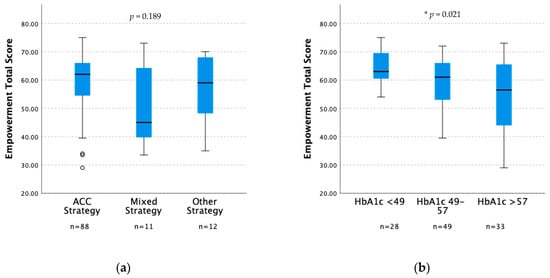 Box plots to visualize empowerment, total score according to different strategies for insulin dosing (ACC, mixed, other) and different levels of HbA1c. * indicating significant difference. Independent-sample Kruskal–Wallis test was performed. (a) Empowerment, total score (y-axis), in groups using different insulin dosing strategies, p = 0.189. (b) Empowerment, total score (y-axis), in groups with different glycemic control, p = 0.021.