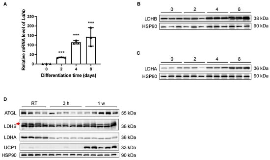 Theoretically, LDHB is able to catalyze the interconversion between pyruvate and lactate in both directions; however, it preferably catalyzes the oxidation of lactate to pyruvate, sustaining the TCA cycle for energetic demands []. In light of the essential enzymatic role of LDHB, the potential involvement of LDHB in adipogenesis was examined in vitro. As shown by both qRT-PCR and Western blotting analyses, the expression levels of Ldhb/LDHB were dramatically increased in differentiated SVF preadipocytes isolated from iWAT at Day 2 (D2), D4, and D8, compared with the undifferentiated D0 control (Figure 1A,B). Similarly, the expression of LDHA was also elevated during the differentiation process of beige adipocytes (Figure 1C). Together, these data imply a potential role of LDHB in adipocyte differentiation. Next, we conducted prolonged cold-exposure experiments (1 w) to evaluate the involvement of LDHA and LDHB in the lipolysis and thermogenesis of iWAT, which are highly energetic processes. As the elevation in the uncoupling protein 1 (UCP1) expression level indicated [,], the cold-exposure experiments were properly performed (Figure 1D). At the onset of cold stimulation (3 h post-exposure), the protein levels of LDHA and LDHB dramatically decreased (Figure 1D). However, while the expression of LDHB recovered at the late stage of cold exposure, the reduction in LDHA level was sustained at 1 w (Figure 1D). These data suggest an essential role for LDHB in the lipolysis and thermogenesis of beige adipocytes.