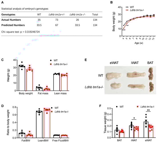 Mouse genotyping and statistical analysis based on numbers of littermates revealed that neither a heterozygous nor homozygous knockout of Ldhb affected the birth of mice (Figure 2A). Thus, we next analyzed the phenotype of homozygous knockout (Ldhb tm1a −/−) mice. At 4 and 5 w post-natal, Ldhb tm1a −/− mice exhibited a lower body weight than their control littermates (Figure 2B). However, the observed difference diminished at the later stage of their lifespan, which was after weaning (typically at 3–4 weeks of age) (Figure 2B). At 11 w of age, there were no significant differences in body weight or lean mass of WT and Ldhb tm1a −/− mice (Figure 2B–D). However, slight reductions in both fat mass and fat/body weight ratio were observed in Ldhb tm1a −/− mice (Figure 2C,D). Consistent with this, Ldhb tm1a −/− mice had smaller masses of iWAT and eWAT than the control littermates (Figure 2E,F). Together, these results indicate that the loss of Ldhb potentially causes abnormality in AT development during the early stage of postnatal growth, or enhanced utilization of fatty acids as fuel source.