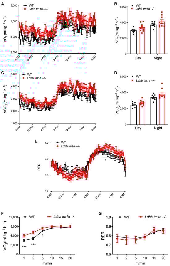 Disruption of Ldhb-altered global energy metabolism of mice at nighttime and during early stage of exercise. (A–D) The oxygen consumption (VO2, (A,B)) and carbon dioxide production (VCO2, (C,D)) of Ldhb tm1a −/− mice or control littermates (WT) (n = 9 or 7 for Ldhb tm1a −/− mice or WT, respectively). (E) RER of Ldhb tm1a −/− mice or control littermates (WT) were calculated based on data above (n = 9 or 7 for Ldhb tm1a −/− mice or WT, respectively). (F,G) The oxygen consumption (VO2, (F)) and RER (G) of Ldhb tm1a −/− mice or control littermates (WT) during running session (n = 13 or 10 for Ldhb tm1a −/− mice or WT, respectively). * p < 0.05, *** p < 0.001.