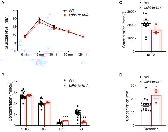 The effect of Ldhb loss on the absorption and utilization of glucose were next studied, beginning with a glucose tolerance test (GTT). Comparing data collected from Ldhb tm1a −/− mice to those from the control littermates, no significant differences were observed in the initial glucose levels, glucose levels at 15 min post-injection, or glucose levels at the end of the evaluation, when the serum glucose level returned to normal (Figure 4A). Besides, the blood biochemistry tests showed that, while the concentrations of low-density lipoprotein cholesterol (LDL) were higher in Ldhb tm1a −/− mice, their serum concentrations of triglycerides (TG) and non-esterified fatty acids (NEFA) exhibited significant reductions (Figure 4B). Interestingly, Ldhb tm1a −/− mice had higher serum levels of creatinine (Figure 4D), an alternative fuel source for the body, and calcium (Ca2+, Supplemental Figure S1B).