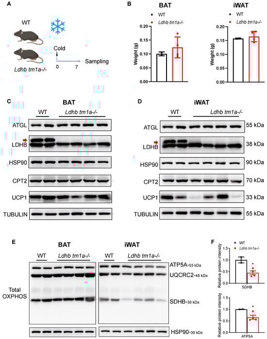 Cold exposure is an effective mechanism to stimulate heat-generating activity in BAT and to boost adaptive metabolism, i.e., to increase energy expenditure, in WAT. Thus, we conducted prolonged cold-exposure experiments (1 w) and collected both BAT and iWAT at the end of treatment (Figure 5A,C,D). As mentioned earlier, while the masses of BAT were similar between the Ldhb tm1a −/− mice and the control littermates, Ldhb tm1a −/− mice had reduced masses of iWAT (Figure 2E,F). Notably, after one week of cold exposure, the differences observed in iWAT weights diminished (Figure 5B), implying the failure of iWAT utilization in Ldhb tm1a −/− mice. In addition, we performed total OXPHOS Western blotting analyses to detect the complex II (CII) subunit SDHB, the CIII-Core protein 2 (UQCRC2), and the CV alpha subunit ATP5A. Compared to the control littermates, the statistical analyses of SDHB and ATP5A revealed significant reductions in iWAT samples collected from Ldhb tm1a −/− mice (Figure 5E,F), suggesting a detrimental effect of LDHB loss on OXPHOS.
