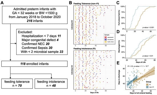 Study design, sample characteristics, and clinical differences in infants with and without feeding intolerance. (A) Flow chart of study design. (B) Fecal samples were collected at a weekly routine of all enrolled infants during hospitalization. X axis and Y axis represent different days of postnatal age and different infants, respectively. Fecal samples were all analyzed for calprotectin level (red color). Fecal samples in blue and yellow color were further analyzed for microbiome (blue color) or multi-omics (microbiome and metabolome, yellow color), respectively. (C,D) Differences in time to reach full enteral feeding (C) and days of hospitalizations (D) between infants with and without feeding intolerance, respectively. Yellow and blue color for infants with and without FI, respectively. (E) Correlations between days to full enteral feeding and days to discharge using Pearson’s method. Yellow and blue color for infants with and without FI, respectively.