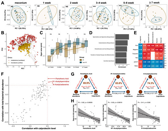 We then focused on the metabolic change and its roles in the microbiota–host interactions in very preterm infants. Longitudinal analysis of fecal metabolome profiles in very preterm infants revealed distinct differences between the FI group and non-FI group at 3–4 weeks (PERMANOVA: R2 = 4.2%, p < 0.001) and 5–6 weeks of postnatal age (PERMANOVA: R2 = 8.4%, p < 0.001) (Figure 4A). Procrustes analysis demonstrated a strong correlation between the metabolic niche and microbiota profiles during early life (R2 = 55.3%, p = 0.001, Figure 4B). To identify specific metabolic shifts associated with FI, all 1908 detected metabolites with HMDB annotations were clustered into 12 highly correlated modules using the WGCNA analysis (Figure S3A). Among the modules significantly associated with FI (Figure S3B), the eigen value of the ‘pink’ module, which contains 54 metabolites, exhibited the most significant alterations in the FI group compared to the non-FI group, particularly during 3–6 weeks of age (Figure 4C). MSEA revealed that major metabolic pathways in the ‘pink’ module included Spermidine and Spermine Biosynthesis, Catecholamine Biosynthesis, and Pantothenate and CoA Biosynthesis (Figure 4D). Regarding multi-omics correlations, the eigen value of the ‘pink’ module showed a weak association with postnatal age (Spearmen’s rho = 0.16) but exhibited the strongest correlations with FC levels (Spearmen’s rho = 0.48) and bacterial abundance (Spearmen’s rho = 0.52), suggesting its potential involvement in microbiota–host interactions (Figure 4E). Furthermore, correlations between the intensity of all metabolites in the ‘pink’ module and FC levels and bacterial abundance were examined in samples collected at or after two weeks of age (Figure 4F). Notably, pantothenic acid and two polyamines (N1-Acetylspermidine and N-Acetylcadaverine) showed the strongest associations with FC levels and total bacterial abundance (Figure 4F and Figure S3C). Mediation analyses revealed that these metabolites had high mediating effects, explaining 69.9%, 65.8%, and 74.3% of the effects of bacterial abundance on FC, respectively (Figure 4G). Moreover, the levels of these metabolites at three to four weeks of age were negatively correlated with the time taken to achieve full enteral feeding (Figure 4H) and the length of hospital stay (Figure S3D), respectively.