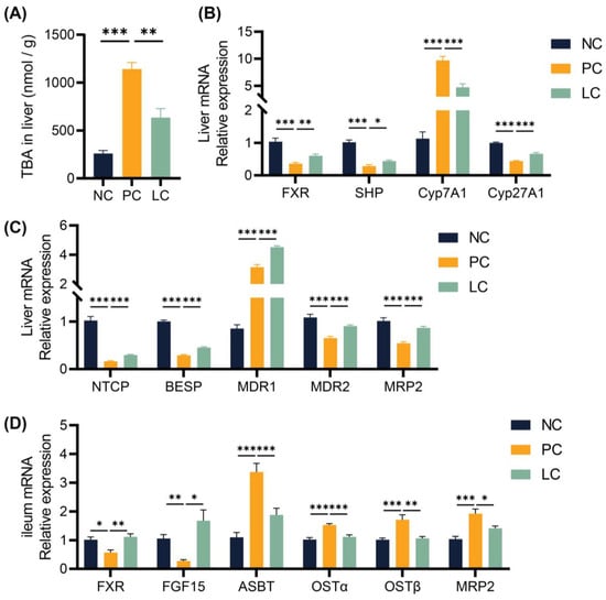 Bidirectional communication between the gut, its microbiota, and the liver is established through the portal vein []. Gut-derived products enter the liver through the portal vein, while BAs secreted by the liver regulate intestinal microecological composition []. The gut–liver axis provides a potential avenue for microecological therapy in treating liver diseases [,,]. In our study, we used Pediococcus pentosaceus Li05 as a treatment and observed a significant increase in Pediococcus in the LC group, demonstrating a successful colonization of Li05 in the gut of mice. Meanwhile, we found the DDC diet induced a significant alternation in gut microbiota composition. A significant overrepresentation of Lactobacillus was found in PSC patients []. Consistently, our results described a higher relative abundance of Lactobacillus in the PC group, and the Li05 treatment decreased the level of Lactobacillus. Anaerostipes and Eubacterium were enriched in the LC group. Anaerostipes spp. metabolizes inositol to produce propionic acid and butyric acid []. Eubacterium spp. carries bile salt hydrolase (BSH) and converts unconjugated primary bile acids CDCA and CA to the secondary bile acids LCA and DCA by 7α-dehydroxylation [,]. Alterations of these microbiota also had an effect on BA pool composition and modulated the process of live damage.
