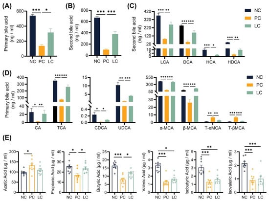 In order to verify the difference in BAs excreted through feces, we quantified the concentration of BAs in fecal samples. The results revealed a significant decrease in concentrations of both primary and secondary BAs in the feces of mice in the PC group compared to the NC groups. Compared to the PC group, concentrations of total, primary, and secondary BAs in the LC group increased (Figure 4A,B). Specifically, the concentrations of six primary BAs, including CA, TCA, CDCA, UDCA, α-MCA, and β-MCA, decreased significantly in the PC group compared to the NC group. The concentrations of CA, TCA, CDCA, UDCA, α-MCA, and β-MCA were elevated in the LC group (Figure 4D). In contrast, concentrations of T-αMCA and T-βMCA were elevated in the PC group, while treatment with Li05 resulted in a decrease in both T-αMCA and T-βMCA levels (Figure 4D). Meanwhile, the concentrations of four primary BAs, including LCA, DCA, HCA, and HDCA, were significantly lower in the PC group compared to the NC group, and Li05 treatment increased LCA, DCA, HCA, and HDCA (Figure 4C).