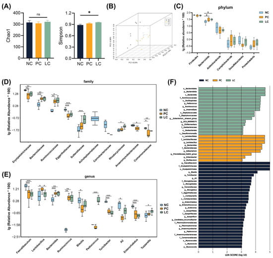 We conducted 16S rRNA gene sequencing to explore the alternation of the gut microbiota composition. No significant differences were found between the NC and PC groups when assessing α diversity using the Chao1 and Simpson indexes. However, a slight increase in the Simpson index was noted in the LC group compared to the NC group (Figure 5A). Adonis analysis revealed a significant alternation in gut microbiota composition among the NC, PC, and LC groups (Figure 5B).