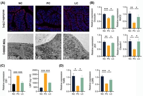 To investigate the impact of the DDC diet on the intestinal barrier, we performed immunofluorescence staining of colon tissue and qRT-PCR to assess the expression levels of intestinal tight junction proteins. Colonic occludin immunofluorescence staining showed a decreased distribution of occludin in the PC group, and the intestinal barrier was more intact in the LC group compared to the PC group (Figure 6A). Meanwhile, the TEM results revealed that microvilli in the PC group exhibited ruptures and sparsity, while those in the LC group appeared denser and more intact (Figure 6A). Correspondingly, significantly lower levels of ZO-1, occludin, claudin1, and MUC2 levels of CB1 transcripts in the colon were found in the PC group. Compared to the PC group, the Li05 treatment restored the expression of ZO-1, occludin, claudin1, and MUC2 (Figure 6B). The level of cannabinoid G-coupled protein receptors (CB1) greatly increased in the PC group (Figure 6C). Consequently, a higher level of lipopolysaccharide-binding protein (LBP) was detected in the serum of the PC group, whereas the LBP level was significantly decreased in the LC group (Figure 6C). Furthermore, we observed the repression of both TGR5 and LGR5 transcript levels in the PC group. However, treatment with Li05 resulted in increased expression of TGR5 and LGR5 compared to the PC group (Figure 6D).
