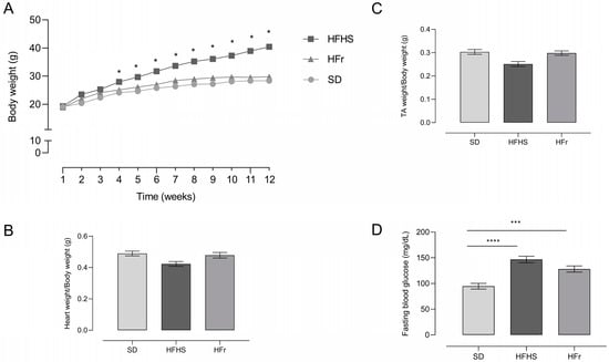Body weight (A), heart weight (B), tibialis anterior (TA) skeletal muscle weight (C), and fasting blood glucose (D) in SD-, HFHS-, and HFr-fed mice at the end of the 12-week dietary protocol. Glucose level (mg/dL) in blood was analyzed after 12 h of fasting. Data are means ± SEM (n = 15 per group). The statistical significance level was set at p < 0.05. Statistical significance: * p < 0.05 vs. SD; *** p < 0.001 vs. SD; **** p < 0.0001 vs. SD.