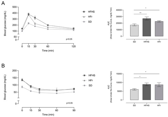 The HFHS and HFr diets determined an impaired response to both the OGTT and ITT, indicating a condition of glucose and insulin intolerance induced by the two diets (Figure 2).