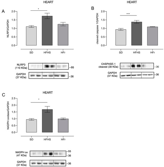 NLRP3 expression significantly increased in HFHS-fed mice (p < 0.05), whereas the HFr diet did not induce significant changes compared to the SD (Figure 3A). Consequently, the expression of cleaved Caspase-1, namely the activated form of Caspase-1, responsible for the maturation of the pro-inflammatory cytokines IL-1β and IL-18, was, as expected, higher in the HFHS group (p < 0.001) (Figure 3B). Oxidative stress in the heart tissue of HFHS-diet-fed mice was demonstrated by a significant increase in the expression of NADPH oxidase compared to both the SD and HFr groups (p < 0.05) (Figure 3C).