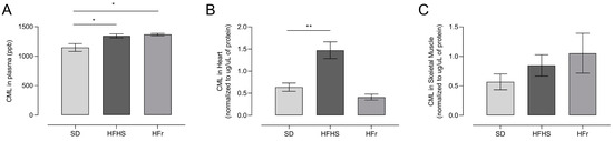Plasma CML levels significantly increased (p < 0.05) in HFHS- and HFr-diet-fed mice compared to SD-fed mice (Figure 4A). CML levels were raised significantly in the hearts of HFHS-fed mice, but not in the hearts of HFr-fed mice (Figure 4B). CML levels did not show any significant difference in the TA muscle of either HFHS or HFr mice compared to SD-fed mice (Figure 4C).