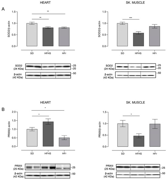 SOD2 showed a marked 20% significant decrease (p < 0.01) in HFHS and HFr heart samples in comparison to their SD counterparts, whereas a statistically significant 40% decrease compared to the SD samples (p < 0.001) was found in TA skeletal muscle samples of HFHS-fed mice only; a tendency to decrease was found in those from HFr-fed animals (Figure 5A). As for PRXIII expression, there was a significant 40% increase (p < 0.05) in the heart of HFHS animals with respect to the values found for the SD group, whereas it was significantly (50%) reduced (p < 0.05) in their counterparts from HFr mice. TA skeletal muscle samples presented a statistically significant 50% reduction (p < 0.05) in the HFHS group and no statistically significant change in the HFr group in comparison with SD animals in terms of PRXIII expression, suggesting a differential response to the nutritional regimens in the analyzed tissues (Figure 5B).