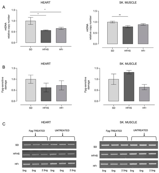 As for the heart samples, both HFHS and HFr diets implied, respectively, a significant loss of mtDNA content, of 42% and 34%, in comparison with SD samples (p < 0.05). Conversely, only the HFHS diet induced a statistically significant (21%) loss of mtDNA in TA skeletal muscle (p < 0.01), while the HFr diet did not imply any significant change (Figure 6A). The detection of the incidence of OH8dG in the D-loop region of mtDNA showed the presence of a n.s. 40–30%-decreased level of oxidized base in the heart in, respectively, both HFHS- and HFr-fed mice. In TA skeletal muscle samples, unexpectedly, there was a n.s. 32% increase in the frequency of oxidized bases in HFHS-fed mice only, whereas in their counterparts from HFr-fed mice, there was a n.s. 36% decrease in the oxidative damage assayed (Figure 6B,C).