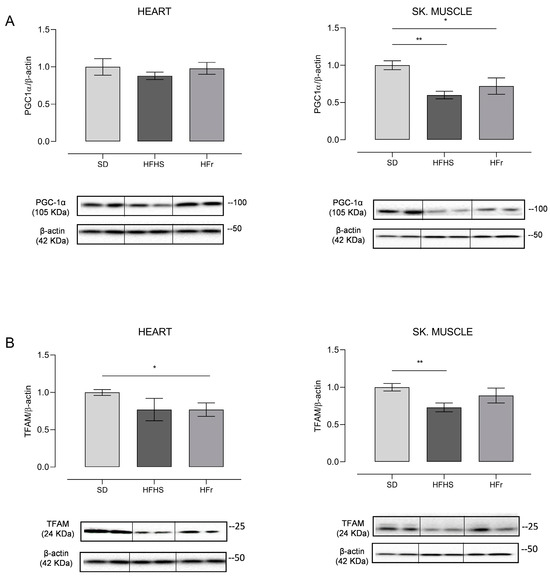 Western blot analysis of proteins involved in mitochondrial biogenesis PGC-1α (A) and TFAM (B) in heart and TA skeletal muscle samples from SD, HFHS, and HFr mice. (A) In the histogram, the ratio of the intensity of the PGC-1α vs. β-actin bands is shown. A representative Western blot showing the results for two mice from each group is shown in the inset. (B) The histogram shows the ratio between TFAM vs. β-actin intensities. As a representation, Western blot results obtained from two mice from each group are shown. (A,B) Data shown are the results of Western blot experiments conducted at least in triplicate. Results were analyzed using one-way ANOVA. Bars represent the mean values ± SEM (n = 5 per group). (See also Supplementary Figures files S1 and S2). Data are normalized vs. the values for the SD group, fixed as 1. Statistical significance: * p < 0.05 vs. SD; ** p < 0.01 vs. SD.