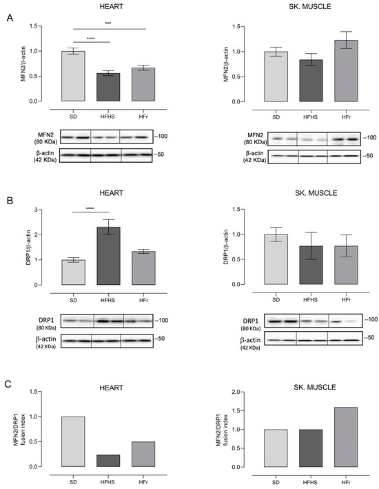 Western blot analysis of proteins involved in mitochondrial dynamics. Amounts of MFN2 and DRP1 proteins and fusion index (FI) in heart and TA skeletal muscle samples from SD, HFHS, and HFr mice. (A) In the histogram, the ratio of the intensity of the MFN2 vs. β-actin bands is shown. A representative Western blot showing the results for two mice from each group is shown in the inset. (B) The histogram shows the ratio between DRP1 vs. β-actin intensities. As a representation, Western blot results obtained from two mice from each group are shown. (A,B) Data shown are the results of Western blot experiments conducted at least in triplicate. Results were analyzed using one-way ANOVA. Bars represent the mean values ± SEM (n = 5 per group). (See also Supplementary Figures files S1 and S2). Data are normalized against the value of the SD group, fixed as 1. Statistical significance: *** p < 0.001 vs. SD; **** p < 0.0001 vs. SD. (C) Fusion index (FI). Bars represent the mean value of the fusion index (FI) value as the ratio between MFN2 and DRP1 for each of the examined mice. Data are normalized against the values for the SD group, fixed as 1.