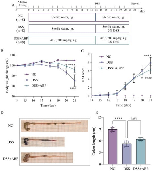 The experimental design is shown in Figure 1A. During the initial 14 days, all mice received sterile water, whereas the DSS + ABP group received ABP (200 mg/kg, intragastrically (i.g.) (after referencing the literature, 50, 100, and 200 mg/kg/d were utilized in the initial tests, and 200 mg/kg/d was finally selected for the formal experiment)) [,,]. For the next 7 days, both the DSS and DSS + ABP groups were treated with 3% DSS, whereas the DSS + ABP group continued with ABP treatment. The NC group received daily treatment with distilled water. On day 22, the mice were sacrificed under anesthesia for the collection of colon tissues and blood samples.