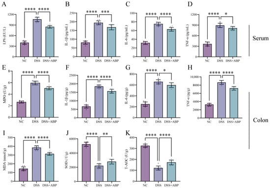 Fruchon S et al. [,] reported that ABP is significant in regulating the relationship between inflammatory and oxidative factor expression. ELISA results showed that DSS induction significantly increased the serum levels of LPS, IL-1β, IL-6, and TNF-α in mice compared to the NC group (p < 0.0001). However, ABP treatment markedly reduced the expression of these factors (Figure 2A–D). At the same time, the levels of IL-1β, IL-6, and TNF-α in colon tissues were also measured and were consistent with the serum results (Figure 2F–H). DSS was found to increase MPO and MDA expression and decrease SOD and T-AOC levels, whereas ABP reversed these changes (Figure 2E,I–K). These results suggest that ABP intervention can significantly inhibit DSS-induced inflammation and oxidative stress.