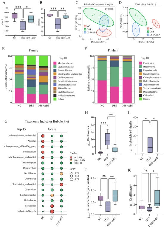 16S rRNA analysis of the effect of Agaricus blazei Murrill polysaccharide (ABP) on gut microbiota. (A) Chao1 index; (B) Shannon index; (C,D) PCA and PCoA analysis; (E,F) top 10 display charts of species composition at the family level and phylum level; (G) top 15 displays of taxonomy indicators at the genus level; and (H–K) abundance of four bacterial genera (Bacteroides, Escherichia-Shigella, Ruminococcaceae_unclassified, and Oscillibacter) in different groups. Data are presented as mean ± SD, (n = 6). ns p > 0.05, * p < 0.05, ** p < 0.01, and *** p < 0.001.